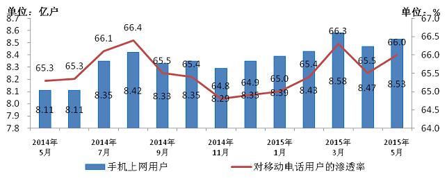 圖4 2014-2015年5月手機上網(wǎng)用戶和對移動電話用戶滲透率情況