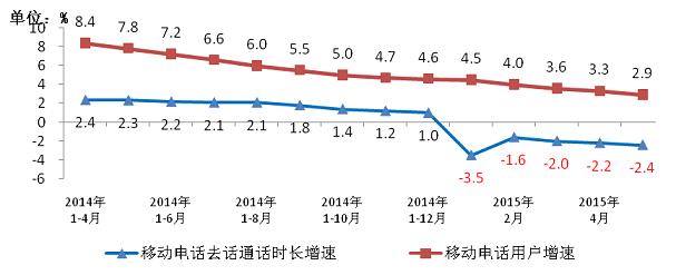 圖5. 2014-2015年4月移動電話去話通話量和移動電話用戶同比增長比較