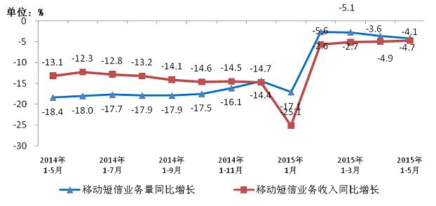 圖6. 2014-2015年5月移動短信業(yè)務(wù)量和移動短信收入同比增長情況