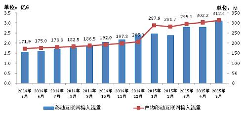圖7 2014-2015年5月移動互聯(lián)網(wǎng)接入流量和戶均流量比較