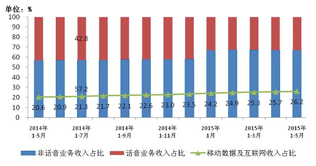 圖9 2014年-2105年5月話音、非話音、移動數(shù)據(jù)及互聯(lián)網(wǎng)收入占比情況
