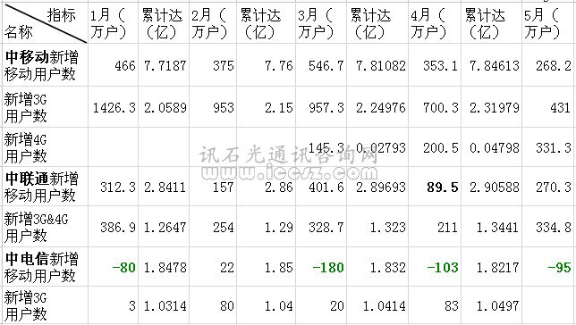 5月,中國移動新增移動用戶數(shù)268.2萬戶,達7.87295億戶;4G客戶新增331.1萬戶,達810.9萬戶;3G用戶數(shù)新增431萬。5月,中國聯(lián)通凈增移動用戶270.3萬戶,達2.93291億戶;移動寬帶用戶(也即3G&4G用戶)數(shù)凈增334.8萬,累計達1.37758億戶。5月,中國電信的移動用戶再度流失95萬,總數(shù)降至1.8122億戶,由于小編未搜索到中國電信相關(guān)公告,因此不清楚3G用戶數(shù)。