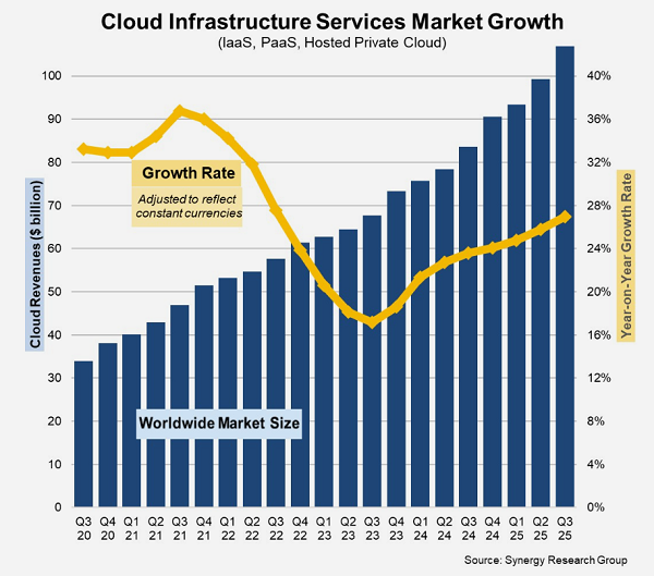 ICC訊 來自Synergy研究集團的最新數(shù)據(jù)顯示,2025年第三季度,企業(yè)在云基礎(chǔ)設(shè)施服務(wù)上的支出較上一季度猛增超過75億美元,這是迄今為止最大的環(huán)比增幅。在剔除了該期間一些主要貨幣波動的影響后,這一數(shù)據(jù)較去年第三季度增長了28%,標志著同比增長率連續(xù)第八個季度上升,同時也是該市場三年來最高的增長率。