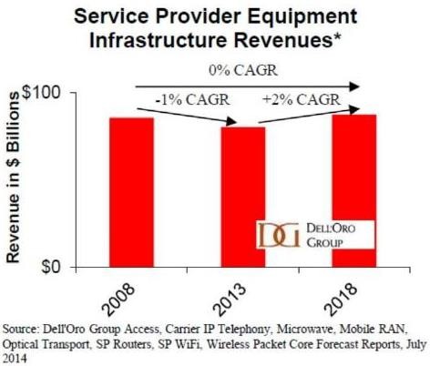 支出的上揚(yáng)對(duì)于設(shè)備商來(lái)說(shuō)將是可喜的消息,因?yàn)閺?008年到2013年以來(lái),設(shè)備商銷售收入以-1%的CAGR在萎縮。Dell'Oro將該市場(chǎng)定義為應(yīng)用于接入、運(yùn)營(yíng)商IP電話、微波、移動(dòng)RAN、光網(wǎng)絡(luò)、服務(wù)供應(yīng)商路由器、服務(wù)供應(yīng)商Wi-Fi和無(wú)線分組核心的設(shè)備銷售收入。