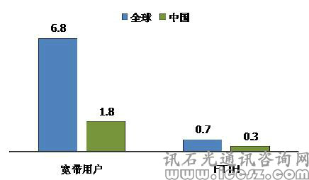 截至2013年6月全球?qū)拵?FTTH用戶情況(億戶)