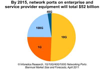 Infonetics公司預(yù)測(cè),2015年設(shè)備制造商在1G/10G/40G/100G以太網(wǎng)端口的銷售額將增長(zhǎng)到約520億美元,因?yàn)槠髽I(yè)和服務(wù)提供商將繼續(xù)建立自己的網(wǎng)絡(luò)基礎(chǔ)設(shè)施,以應(yīng)付不斷增長(zhǎng)的流量需求。