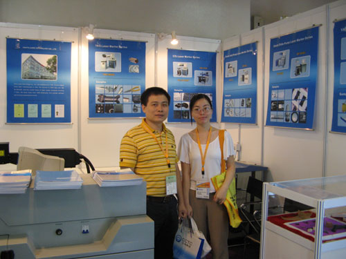 除了潮州三環(huán),我們還在電子展上遇到了大族激光,大族激光是由其香港公司出面參展,但位置還是在中國區(qū)。他們展出了主要是激光應(yīng)用方面的設(shè)備,如用于皮革切割,金屬打標(biāo)的設(shè)備。市場部張海鷹經(jīng)理親自出展。