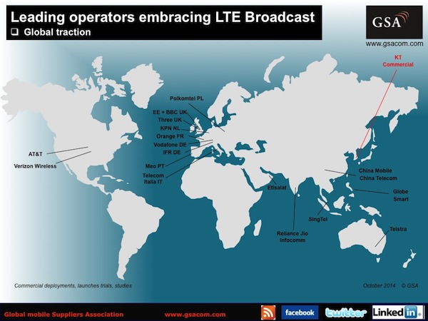 ICCSZ訊 近日,GSA(全球移動設備供應商協會)發(fā)布其最新的關于LTE廣播的市場報告。GSA稱,目前LTE廣播技術(LTE組播)至少有19家移動運營商正在部署、測試或者研究之中,它們分布于澳大利亞、中國、法國、德國、印度、意大利、荷蘭、菲律賓、波蘭、葡萄牙、新加坡、韓國、阿聯酋、英國和美國。