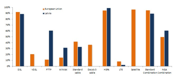 《2011歐洲寬帶覆蓋》調(diào)研報告顯示,拉脫維亞90%的家庭能夠享受基本寬帶服務(wù)(至少提供144kbps的服務(wù),只要他們愿意)。拉脫維亞超高速寬帶覆蓋達61%(也稱為NGA,即下一代接入),且全部是FTTP方式。在調(diào)研的29個國家中(歐盟27國和挪威、冰島),96%能夠獲得基本寬帶,超過50%(一半國家走向2020數(shù)字天堂目標(biāo))能夠獲得超高速。