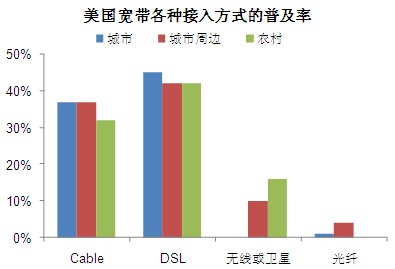 在寬帶接入技術(shù)方面,DSL仍是美國(guó)主要的寬帶接入方式。城市、城市周邊和農(nóng)村的DSL接入率分別是45%、42%和42%。Cable接入方式在城市、城市周邊和農(nóng)村所占的比例分別是37%、37%和32%,農(nóng)村接入率相對(duì)低一些。固定無線或衛(wèi)星方式在城市、城市周邊和農(nóng)村的接入率分別是10%、10%和16%。衛(wèi)星接入方式在農(nóng)村的接入率高于城市和周邊地區(qū)。光纖接入方式上,城市為1%,城市周邊為4%,農(nóng)村幾乎沒有。而電力線接入?yún)s是農(nóng)村寬帶接入的一種獨(dú)特方式。目前有兩種BPL系統(tǒng):一種是室內(nèi)BPL,另一種是利用室外中等水平的電壓線傳輸高速通信信號(hào)。
