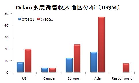 截至2010年4月3日的三個月,Oclaro銷售額同比增加145%至5990美元,增長主要來自去年4月與Avanex公司合并所產(chǎn)生的收入,與電信業(yè)務(wù)密切相關(guān)。本季度電信和先進(jìn)光學(xué)解決方案部門收入分別比去年同期增長4980萬元和1010萬美元,其中先進(jìn)光學(xué)解決方案部門收入增加主要來自New Focus業(yè)務(wù)收入。