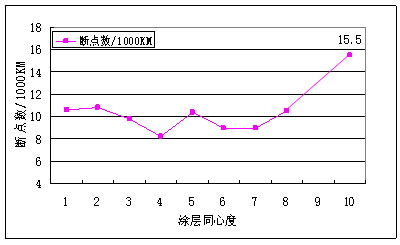 根據(jù)上圖所示,當(dāng)涂層的同心度小于8時(shí),每1000KM光纖的斷點(diǎn)數(shù)在10左右,在篩選中不會(huì)對(duì)光纖強(qiáng)度造成太大影響影響。而當(dāng)光纖同心度達(dá)為10時(shí),斷點(diǎn)數(shù)為15.5。因此,光纖的同心度小于8,可以有效地減少因涂層偏心而引起光纖強(qiáng)度的降低。