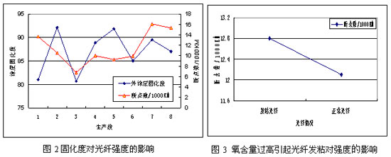 圖2和圖3對(duì)不同固化度光纖和由于氧氣含量過(guò)高而引起光纖表面發(fā)粘發(fā)光纖的強(qiáng)度進(jìn)行的統(tǒng)計(jì)。從圖看出,當(dāng)光纖的固化度的高于80%時(shí),光纖的強(qiáng)度沒(méi)有隨著光纖固化度的升高而升高,而是呈隨機(jī)性的分布。而圖中,固化爐中氧含量過(guò)高造成的表面發(fā)粘的光纖,與正常光纖相比,每1000KM的斷點(diǎn)數(shù)由12.1個(gè)升高到12.8個(gè),沒(méi)有出現(xiàn)較大的升高。
