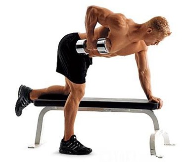 俯身,一只手撐于平凳上,同側(cè)退腿部跪在平凳上,一手持啞鈴自然垂于體側(cè),呼氣,同時向上提拉啞鈴,直至最高點,呼氣,慢慢還原。一般做15-20次為一組,做5-7組。