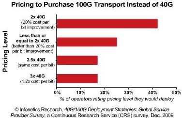 “最值得注意的意見是,一旦每比特成本改善達到20%時,運營商就會對部署40G和100G普遍感興趣,因為技術(shù)可以簡化網(wǎng)絡(luò),實在物有所值。”Infonetics研究公司光網(wǎng)絡(luò)高級分析師Andrew Schmitt說,“運營商的回答不大符合‘以上一代2.5倍成本獲取4倍性能’這一被廣泛接受的準(zhǔn)則。不過,從10G到40G/100G的發(fā)展不同的進程;10G價格現(xiàn)在非常低,在一段時間內(nèi)依然占據(jù)著優(yōu)勢。”