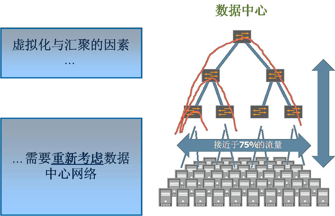 數(shù)據(jù)中心的融合和虛擬化趨勢加速了資源的優(yōu)化及成本的下降。融合、虛擬化及存儲對網(wǎng)絡(luò)性能和安全都提出了更高的要求。而服務(wù)器虛擬化不僅大幅提高了服務(wù)器資源的使用率,也大幅增加了網(wǎng)絡(luò)內(nèi)部的數(shù)據(jù)業(yè)務(wù)量。運(yùn)行在虛擬服務(wù)器環(huán)境下的應(yīng)用,要求更低的延遲、更高的吞吐量、更加強(qiáng)壯的服務(wù)質(zhì)量 (服務(wù)質(zhì)量 (QoS) 和極高的可靠性HA (HIGH AVAILABILITY)。傳統(tǒng)的數(shù)據(jù)中心已經(jīng)不能滿足每端口增加的業(yè)務(wù)量及性能要求。更進(jìn)一步,數(shù)據(jù)存儲的高帶寬和低延遲要求,以及更多的采用iSCSI和NAS,則更增加了對網(wǎng)絡(luò)架構(gòu)的要求。而隨著未來FCoE (Fiber Channel over Ethernet——以太網(wǎng)光纖隧道) 的標(biāo)準(zhǔn)化,該技術(shù)必將對網(wǎng)絡(luò)架構(gòu)提出更高的帶寬和性能要求。