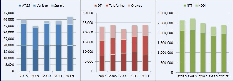 日本方面,2011日本運(yùn)營(yíng)商資本開支由于恢復(fù)地震海嘯損害而短暫上升,但從長(zhǎng)期來看,或逐漸下滑。