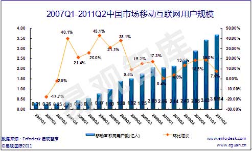 據易觀國際最新發(fā)布的數據顯示,2011年第2季度中國移動互聯網用戶規(guī)模達3.69億人,環(huán)比增長7.6%%,相比去年同期呈現72.3%增長速度。