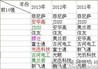 最后來(lái)看看中國(guó)光通信最具品牌競(jìng)爭(zhēng)力前10,雖然綜合實(shí)力不如烽火,但是華為的品牌競(jìng)爭(zhēng)力深入人心,三年來(lái)一直是冠軍,烽火科技緊隨其后。類(lèi)似光纖光纜與設(shè)備業(yè),最具品牌競(jìng)爭(zhēng)力的前幾名的排名三年來(lái)均無(wú)變化。而JDSU與帝斯曼排名上升了,看來(lái),在中國(guó)JDSU與帝斯曼的市場(chǎng)還算不錯(cuò)。另外,PMC-Sierra與古河電工是三年來(lái)首次登榜,PMC-Sierra曾經(jīng)榮膺中國(guó)最具品牌競(jìng)爭(zhēng)力光通信企業(yè),那估計(jì)是三年前的事情了。