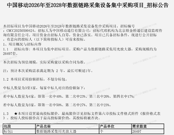 本次采購(gòu)為集中招標(biāo)項(xiàng)目,采購(gòu)產(chǎn)品為數(shù)據(jù)鏈路采集用光放大器,采購(gòu)規(guī)模約為26497套。招標(biāo)公告明確,本次公布的為預(yù)估規(guī)模,實(shí)際采購(gòu)量將以最終簽訂的采購(gòu)合同為準(zhǔn)。預(yù)計(jì)本次采購(gòu)的需求滿足期為2年,最長(zhǎng)可順延1年。值得注意的是,此次需求滿足期設(shè)定為2年,與此前多輪集采通常約定的1年滿足期有所不同,可能反映了更長(zhǎng)的采購(gòu)與部署規(guī)劃周期。