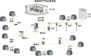 FTTP的光分配網(wǎng)的典型網(wǎng)元包括到光纖分配終端(FDT)的饋線光纜,分光器也位于FDT。分配光纜從FDT連到多光纖業(yè)務(wù)終端,入戶光纜也在這里連接進(jìn)來。然后入戶光纜從MST連到每個用戶大樓的光網(wǎng)絡(luò)終端(ONT)。
