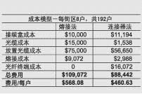 一個有192用戶的成本模型顯示:與傳統(tǒng)架構(gòu)相比,使用了MST和連接器的FTTP網(wǎng)絡(luò)可以使光纜成本降低85%(見表)。這主要是由于光纜費用現(xiàn)在包括在了終端成本里。與此同時,拉光纖的費用降低了大約25%,熔接的費用降低了大約70%。事實上,盡管MST增加了業(yè)務(wù)終端的成本,但是以每戶計的總成本明顯比網(wǎng)絡(luò)配線低大約19%。