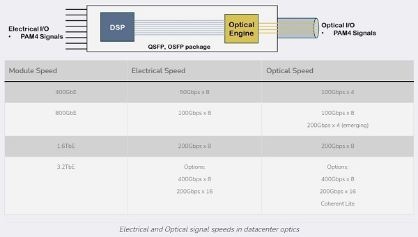 數(shù)據(jù)中心光電信號傳輸近年從50G、100G逐步升級至200G PAM4,DSP速度、光調(diào)制器性能與封裝技術(shù)的進(jìn)步推動著有序迭代。但當(dāng)單通道速率逼近400Gbps時(shí),電信號從交換芯片/GPU到光模塊的傳輸距離成為重大挑戰(zhàn)。