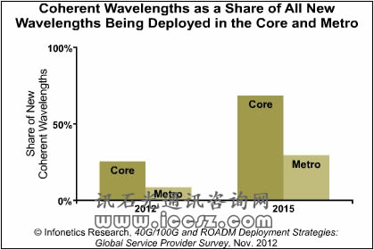 在調(diào)研反饋中,到2015年相干波長在核心網(wǎng)中占到68%,在城域網(wǎng)中占到29%。100G部署波長將從2012年僅僅5%上升到37%。