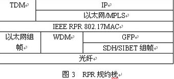 2000年11月IEEE 802.17工作組成立,目標(biāo)是開發(fā)彈性分組環(huán)(RPR)標(biāo)準(zhǔn),優(yōu)化在城域網(wǎng)拓?fù)洵h(huán)上的數(shù)據(jù)包傳輸;該技術(shù)結(jié)合以太網(wǎng)的實(shí)用性和SDH光傳輸設(shè)備的強(qiáng)大功能,利用空分復(fù)用,時(shí)分統(tǒng)計(jì)復(fù)用和保護(hù)環(huán)提高帶寬的利用率,實(shí)現(xiàn)了節(jié)點(diǎn)對(duì)網(wǎng)絡(luò)資源的合理利用,同時(shí)還支持業(yè)務(wù)分級(jí)(SLA),以及即插即用等特性,將城域網(wǎng)轉(zhuǎn)變?yōu)榭焖俸唵?,可靠,并及時(shí)提供豐富增值服務(wù)的寬帶網(wǎng)絡(luò)。圖3示RPR規(guī)約棧。由圖可見RPR通過在環(huán)網(wǎng)上的媒體接入控制(MAC)規(guī)約解決了城域網(wǎng)的現(xiàn)存問題;使其既有以太網(wǎng)低成本,有效和簡單的特性,又有SDH傳輸技術(shù)的高可用性,靈活性,以及50ms環(huán)路保護(hù)的優(yōu)點(diǎn);為網(wǎng)絡(luò)提供一種新的傳輸技術(shù);同時(shí)還能為不同的業(yè)務(wù)提供不同等級(jí)的QoS,滿足了建設(shè)城域網(wǎng)和廣域網(wǎng)對(duì)成本,性能以及維護(hù)管理的需要。