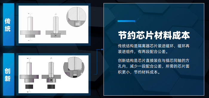 一是節(jié)約芯片材料成本。傳統(tǒng)結(jié)構(gòu)是隔離器芯片裝進(jìn)磁環(huán),磁環(huán)再裝進(jìn)組件,有兩段配合公差。創(chuàng)新結(jié)構(gòu)是芯片直接裝在與插芯同軸的方孔內(nèi),減少一段配合公差,所需的芯片面積更小,節(jié)約材料成本;
