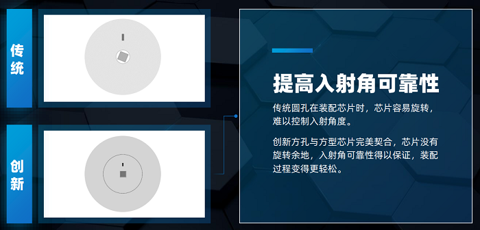 二是提高入射角可靠性。傳統(tǒng)圓孔在裝配芯片時,芯片容易旋轉(zhuǎn),難以控制入射角度。創(chuàng)新方孔與方型芯片完美契合,芯片沒有旋轉(zhuǎn)余地,入射角可靠性得以保證,裝配過程變得更輕松;