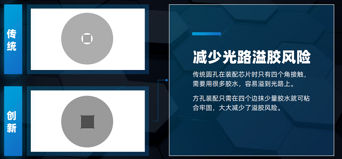 三是減少光路溢膠風(fēng)險。傳統(tǒng)圓孔在裝配芯片時只有四個角接觸,需要用很多膠水,容易溢到光路上。方孔裝配只需在四個邊抹少量膠水就可粘合牢固,大大減少了溢膠風(fēng)險。