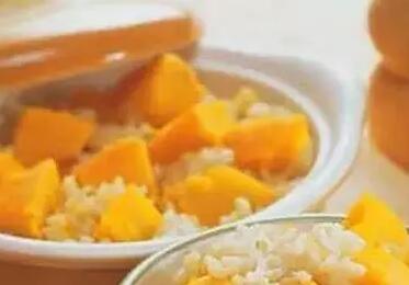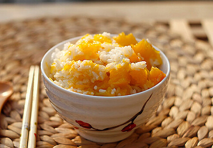 做法是先將南瓜切成小塊,和大米一起蒸20分鐘,再將南瓜搗爛,一起和米飯蒸熟即可。