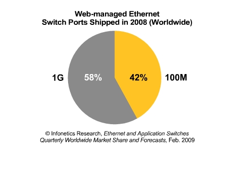 2008年,1G固定配置PoE(power over Ethernet)端口出貨量增長(zhǎng)了56.4%。
