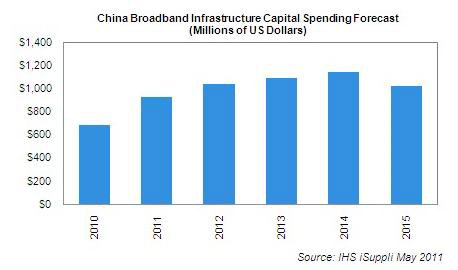 IHS iSuppli統(tǒng)計,2010年中國寬帶資本支出是6.88億美元。未來3年,中國在該項投資上會繼續(xù)增長,直至2014年。但到2015年,隨著城鎮(zhèn)互聯(lián)網(wǎng)用戶的寬帶市場接近飽和,寬帶資本支出將下降到10.2億美元。