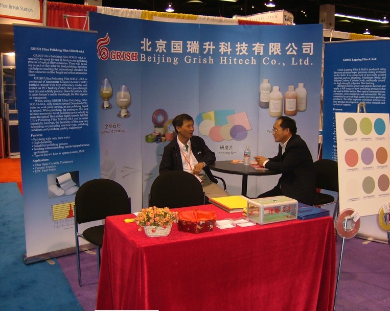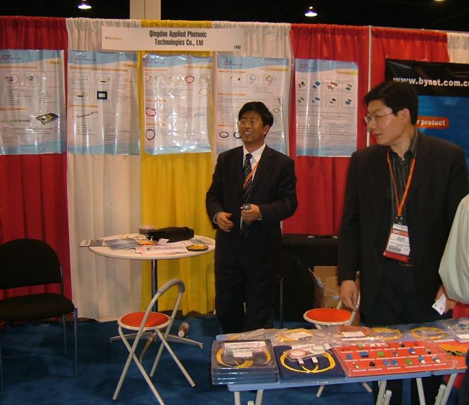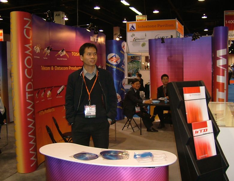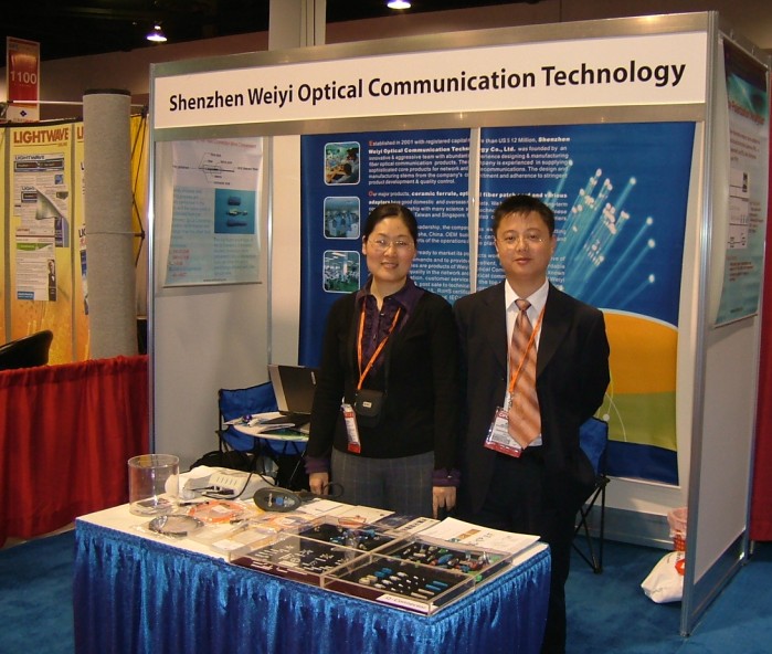 訊石王經(jīng)理與威誼劉博士在展臺(tái)前留影 深圳光纖城通訊有限公司展臺(tái)