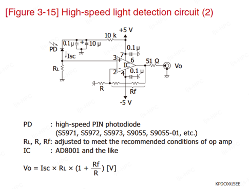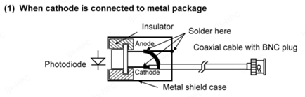 此外,對于金屬封裝的硅光電二極管(通常為2pin腳),需特別注意:有的型號的外殼與陰極連接,有的與陽極連接。為實(shí)現(xiàn)最佳屏蔽效果,建議將外殼接地。具體表現(xiàn)為:若陽極接地,則陰極作為電流流入端;若陰極接地,則陽極作為電流流出端。務(wù)必注意光電流的這種方向性。