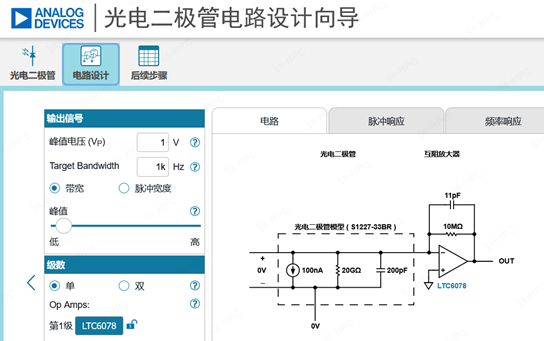 設(shè)計(jì)資源: 我們推薦使用ADI的在線設(shè)計(jì)工具進(jìn)行TIA電路設(shè)計(jì),輸入探測器參數(shù),入射光強(qiáng),輸出電壓,目標(biāo)帶寬等信息,無需手動計(jì)算補(bǔ)償電容,可自動生成原理圖:https://tools.analog.com/cn/photodiode/。