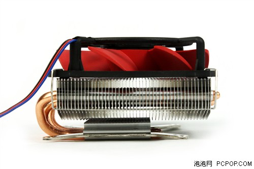 從側(cè)面可以看到散熱器從上到下由風(fēng)扇-鰭片1-鰭片2組成,兩組鰭片各司其責(zé),熱管的彎折角度很均勻,一直保持鈍角,不會影響導(dǎo)熱率。