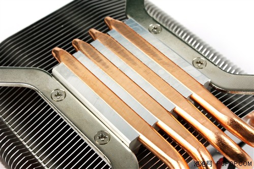 四根合金銅熱管貫穿所有散熱鰭片,而且從這個角度可以看到散熱底座上另有一組鰭片,充分利用了散熱器所占空間,這組散熱器也會把來不及穿到頂部鰭片的熱量散發(fā)掉。目前這款散熱器的市場報價為150元