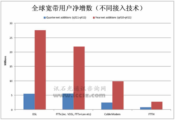 然而,從全年來看,2011年全年新增的寬帶用戶是自2006年以來最多的一年。新市場的寬帶覆蓋走向成熟、寬帶成本的下降以及寬帶越來越多地走進(jìn)我們的生活,這些都為寬帶市場增長創(chuàng)造了有利條件。