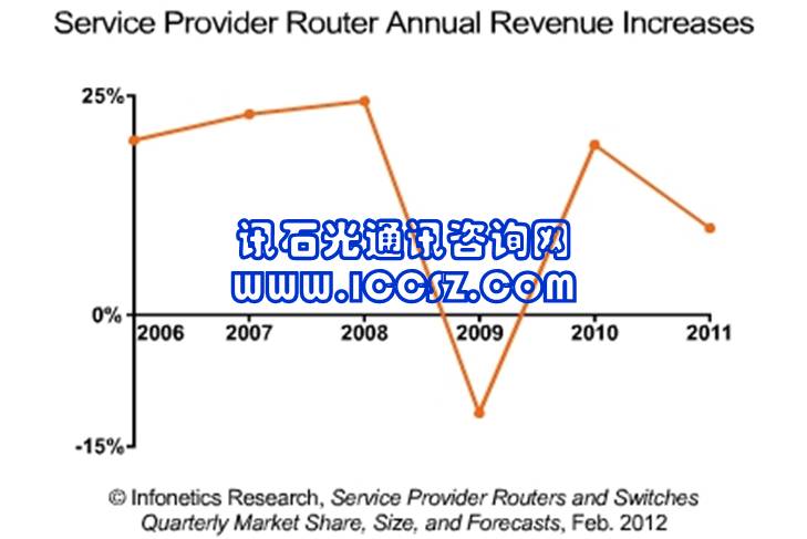 我們可以從運營商級路由器市場的近期走勢來看整體路由器和交換機(jī)市場:把2009年經(jīng)濟(jì)衰退器件的高度異常除外,路由器銷售額一直以兩位數(shù)的年增幅增長,直到2011年,其年增幅只有相對較低的9.9%。