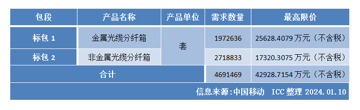 ICC訊 昨日,中國(guó)移動(dòng)于官網(wǎng)發(fā)布招標(biāo)公告,稱“中國(guó)移動(dòng)2024年至2025年光纜分纖箱產(chǎn)品集中采購(gòu)”項(xiàng)目,目前已具備招標(biāo)條件,現(xiàn)進(jìn)行公開招標(biāo)。招標(biāo)編號(hào):CMCC20240500002。