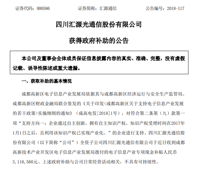 ICCSZ訊(編輯:Aiur) 光纜制造商四川匯源光通信股份有限公司(簡稱匯源通信)發(fā)布公告,表示全資子公司四川匯源光通信有限公司于近日收到成都高新技術(shù)產(chǎn)業(yè)開發(fā)區(qū)電子信息產(chǎn)業(yè)發(fā)展局撥付的電子信息產(chǎn)業(yè)專項(xiàng)現(xiàn)金補(bǔ)貼人民幣311.6萬元。