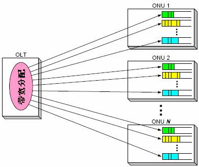 在這樣的配置中,OLT會分配給每個ONU一個不同的LLID。這樣的話,從帶寬分配機制上來說,將會變成一個分級的帶寬分配結(jié)構(gòu)。上層的OLT負責(zé)ONU的帶寬分配,根據(jù)ONU的請求和網(wǎng)絡(luò)現(xiàn)狀,分配給而每個ONU的一定的帶寬;而ONU根據(jù)自身業(yè)務(wù)種類和業(yè)務(wù)的要求,再進行帶寬分配。如圖2所示: