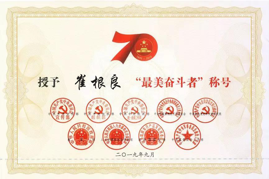 2019年9月25日上午,“最美奮斗者”表彰大會(huì)在人民大會(huì)堂隆重舉行,中共中央政治局常委、中央書記處書記王滬寧會(huì)見了受表彰人員和親屬代表。亨通集團(tuán)黨委書記、董事局主席崔根良,作為新中國(guó)成立以來(lái)涌現(xiàn)的英雄模范,受邀出席“最美奮斗者”表彰大會(huì),并被授予“最美奮斗者”稱號(hào),接受頒發(fā)的“最美奮斗者”證書和獎(jiǎng)?wù)隆?