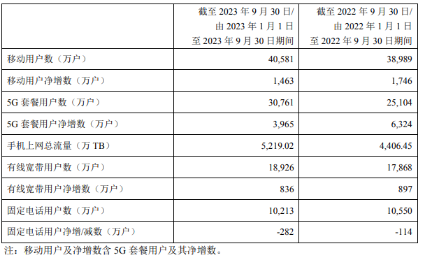 移動(dòng)通信服務(wù)方面,中國電信不斷優(yōu)化5G網(wǎng)絡(luò)覆蓋,圍繞個(gè)人數(shù)字化應(yīng)用需求,加快推進(jìn)5G應(yīng)用AI智能化升級(jí),推動(dòng)用戶規(guī)模和價(jià)值實(shí)現(xiàn)穩(wěn)健增長。2023年前三季度,移動(dòng)通信服務(wù)收入為1519.16億元,同比增長2.4%,移動(dòng)用戶凈增1,463萬戶,達(dá)到約4.06億戶,5G套餐用戶凈增3965萬戶,達(dá)到約3.08億戶,滲透率達(dá)到75.8%,移動(dòng)用戶ARPU為45.6元,同比增長0.2%。