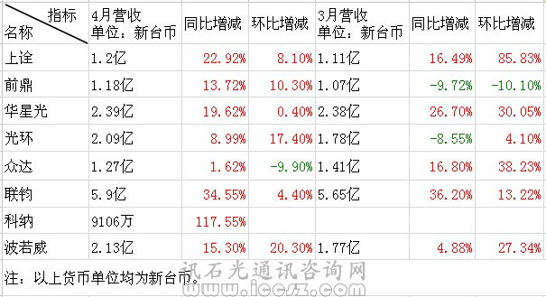 臺灣光通信業(yè)各廠商4月營收數(shù)據(jù)