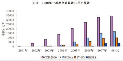圖3 2001~2008年一季度全球3G用戶數(shù)統(tǒng)計(jì)