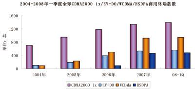 圖5 2004~2008年一季度全球cdma2000 1x/EV-DO/WCDMA/HSDPA商用終端款數(shù)